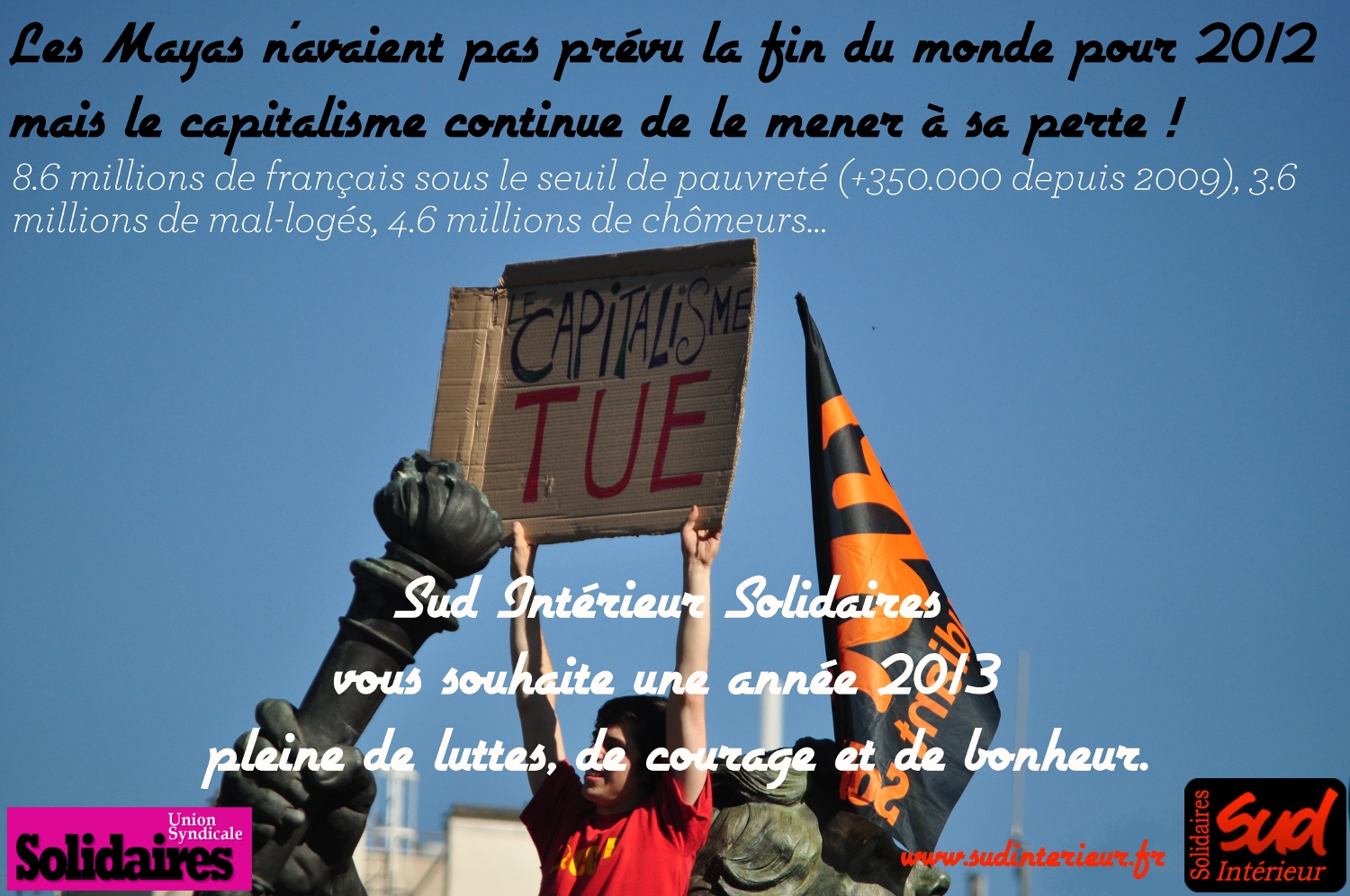 Sud Intérieur Solidaires s’associe à l’Union Syndicale Solidaires pour souhaiter à tous une bonne année 2013. Espérons que sur les plans des lutte et des avancées sociales et sociétales, cette année marquera un tournant, notamment au niveau du Ministère de l’Intérieur. Mais nous nous faisons pas d’illusions. Ce n’est pas de ce gouvernement que viendra ce tournant impératif et décisif mais de la lutte de tous, syndiqué-e ou non, salarié-e, chômeur-se, étudiant-e, retraité-e… à la fois dans la rue mais aussi au quotidien dans les administrations et les entreprises.
