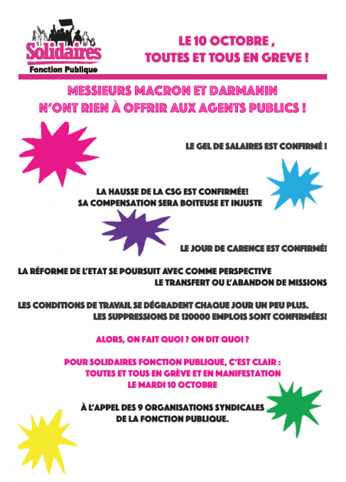 La suite du tract de Solidaires Fonction Publiques ici : Toutes et tous ensemble le 10 octobre – Solidaires Fonction Publiques